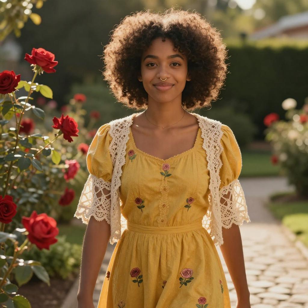 An artistic portrayal of a young Afro-Latina woman in her mid-20s with a voluminous natural afro, warm honey-brown skin, a confident joyful expression, and a delicate gold nose ring dressed in a vintage-inspired mustard-yellow tea dress with puffed sleeves, fitted waist, subtle embroidered rose motifs, and a lightweight cream lace shawl, standing on a cobblestone garden pathway surrounded by vibrant red roses, rendered in a hyperreal cinematic film still with warm golden-hour backlight, shallow depth of field, gentle lens flare, and fine cinematic grain.