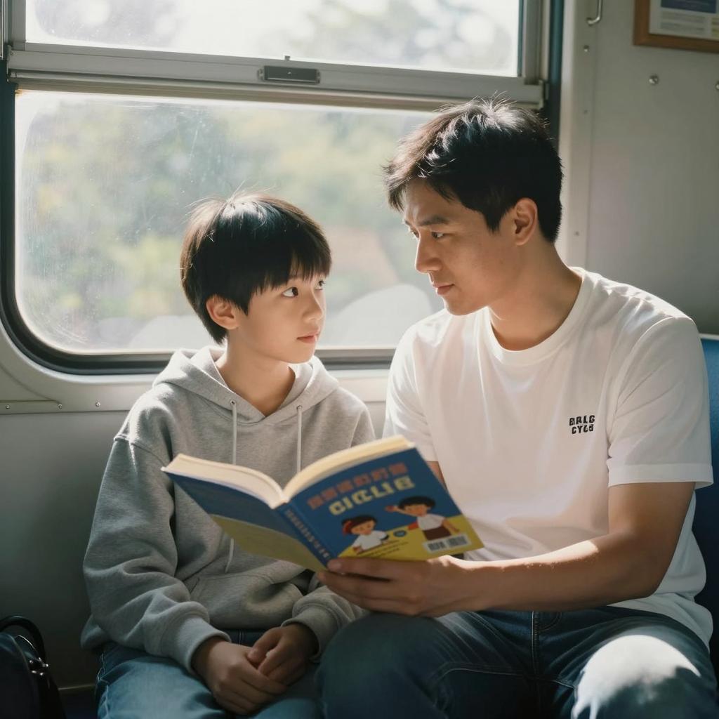 Asian father and his young son sitting together on a train during a sunny morning. The father wearing a white t-shirt is reading a colorful book to his son, who is dressed in a grey hoodie. Natural sunlight shines through the window, creating a warm and intimate atmosphere.