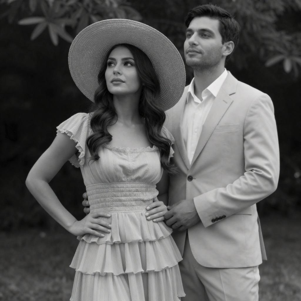 Black and white photograph of a man and woman standing close. Man with dark hair, wearing a suit, bow tie, and jacket, looking directly at the camera. Woman with long, wavy hair, wearing a lace-trimmed dress, looking slightly to the side. Balcony with balusters in the background. Man's right hand on woman's arm. Intense expressions.