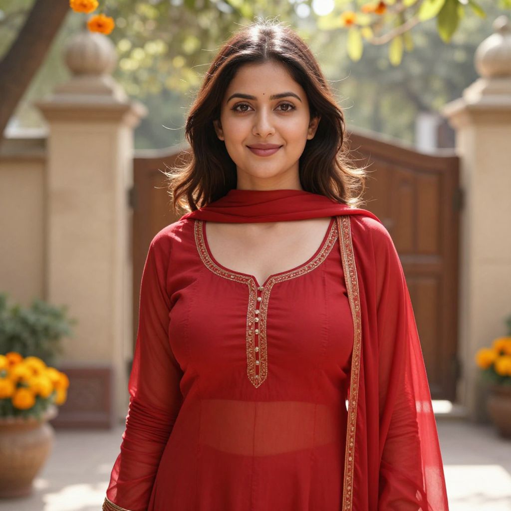 A realistic photography of a young woman with soft brown skin, warm brown eyes, and a natural smile wearing a vibrant red salwar suit costume, standing in a traditional Indian courtyard with marigold flowers and a wooden gate in the background, sunlight filtering through the trees, the salwar suit slightly flowing in the gentle breeze. The woman has big tits and cute face
