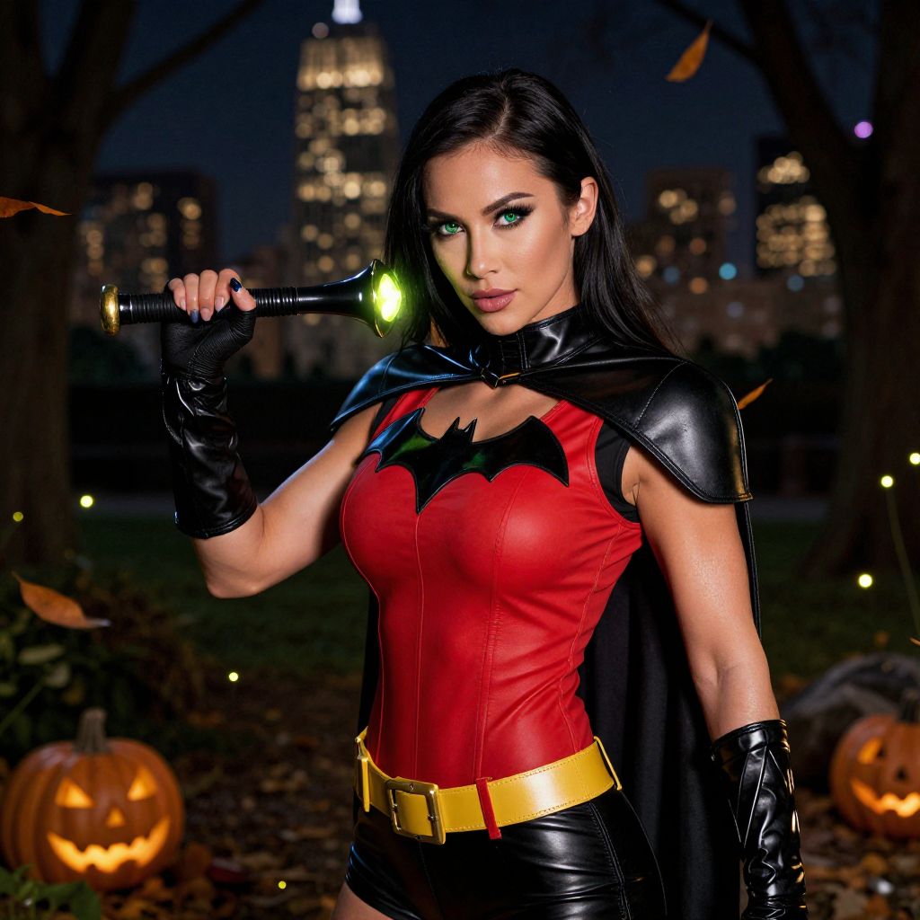 Photograph of a woman dressed as Batgirl at night in a dark urban park. She has long black hair, striking blue eyes, and wears a form-fitting red and black latex costume with a black bat emblem on her chest. A black cape is draped over her shoulders, and she holds a flashlight with a green light in her right hand, raised above her head. Her outfit includes black leather gloves and a yellow utility belt. In the background, there are glowing jack-o'-lanterns and tall buildings with illuminated windows. The scene is illuminated with a mix of moonlight and artificial light, creating a dramatic, superhero Halloween atmosphere.