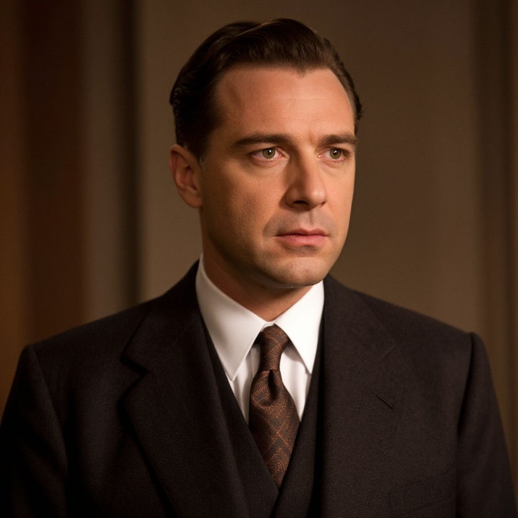 A man in an elegant suit with a vintage tie is portrayed in what appears to be a dramatic movie scene, exuding a classic, sophisticated style reminiscent of mid-20th century cinema.