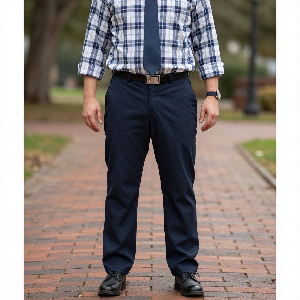 Photograph of a man standing on a brick pathway in a park. He is wearing a black and white checkered shirt with the sleeves rolled up, a dark blue tie, and black dress pants with a silver belt buckle. His black shoes are polished, and he has a black wristwatch on his left wrist. The background is slightly blurred, featuring green grass, trees, and park benches. The image focuses on his lower body and torso, with his face out of the frame. The lighting is natural, highlighting the textures of the brick path and his clothing.