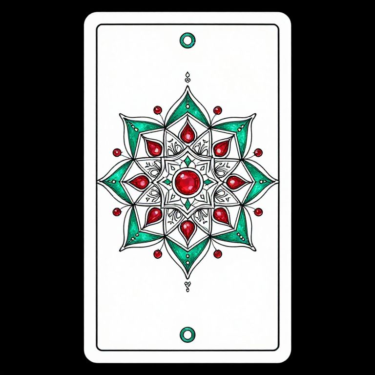Tarot card back design displaying a symmetrical mandala pattern, bright jewel tones of emerald and ruby, delicate line work with a mystical aura, modern and enchanting style