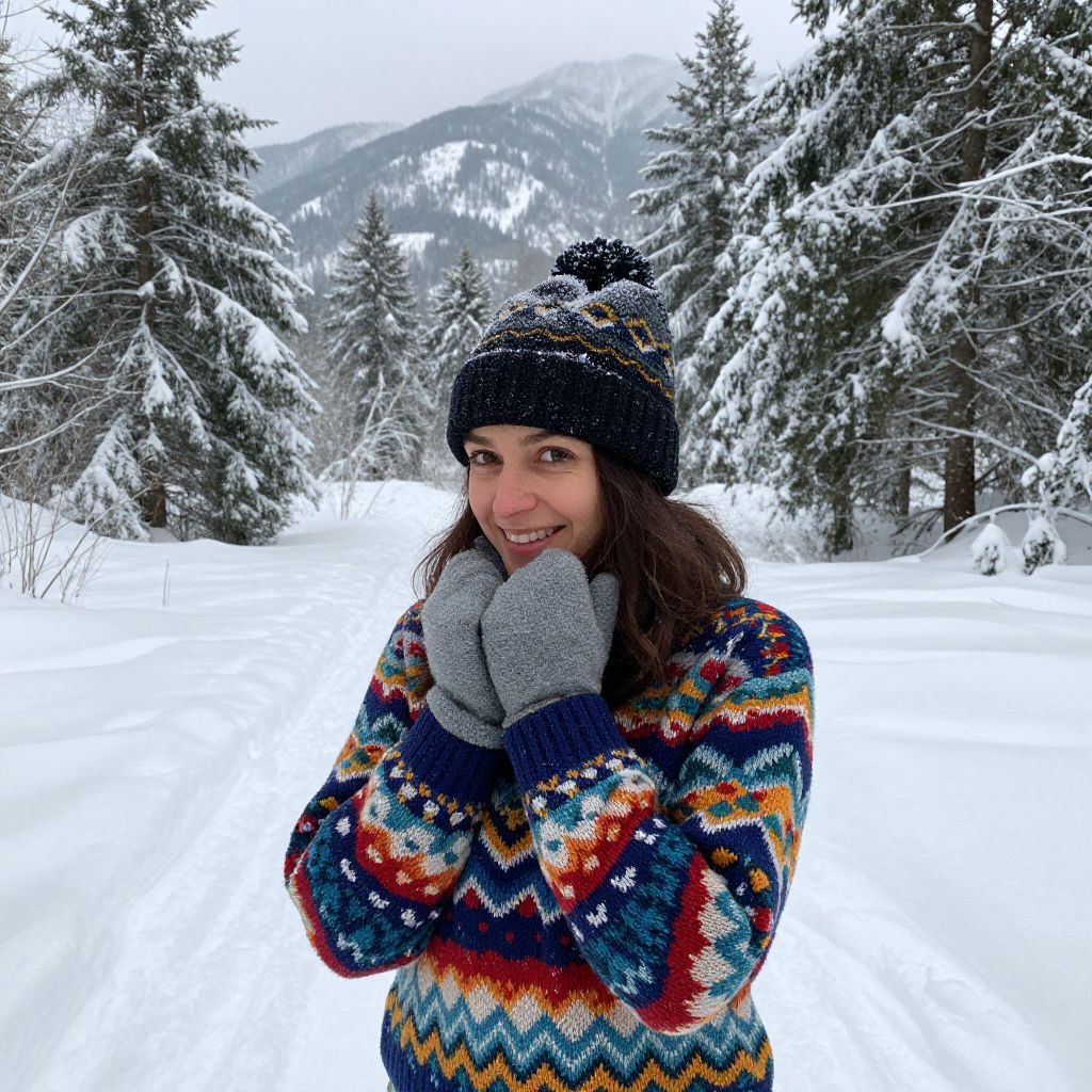 Woman exploring snowy landscape in a vibrant Jacquard-pullover, smiling warmly while wearing a cozy knit hat and gloves, surrounded by snow-covered trees and mountains in the background.