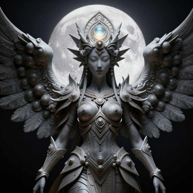 Digital art of a silver-winged, armored angel with closed eyes, wearing intricate headpiece and armor, standing before a glowing full moon.