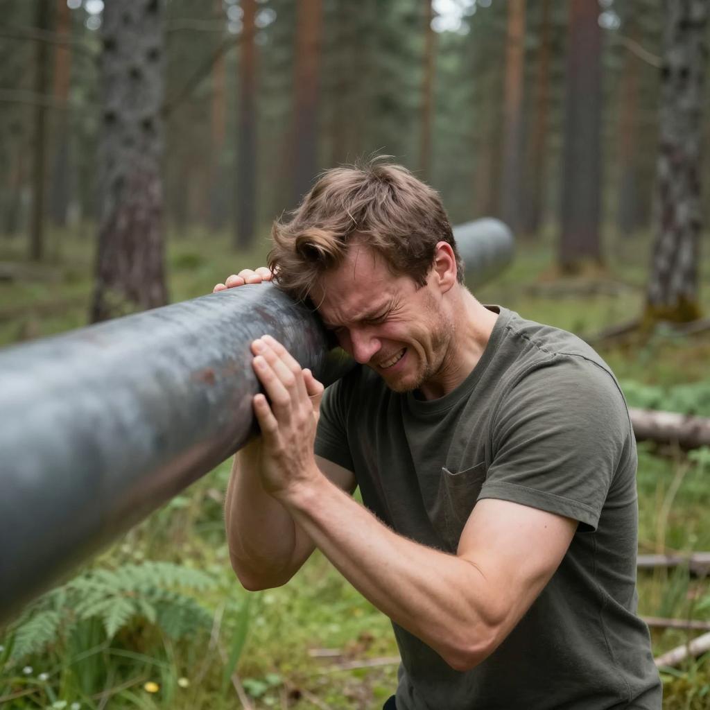Man with short brown hair in dark green shirt, face in pain, being hit in the head by a large metal pipe. Background: forest with tall, thin trees and green grass. Metal pipe motion blur in foreground.