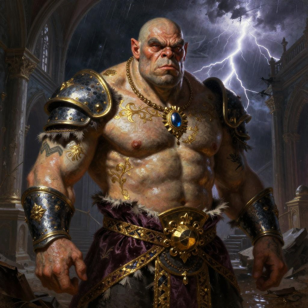 3D Render of a super buff ogre, designed in Stop-motion Claymation with emphasis on fingerprint-textured clay skin and stitched patchwork clothing in a dusty abandoned puppet theater with scattered props