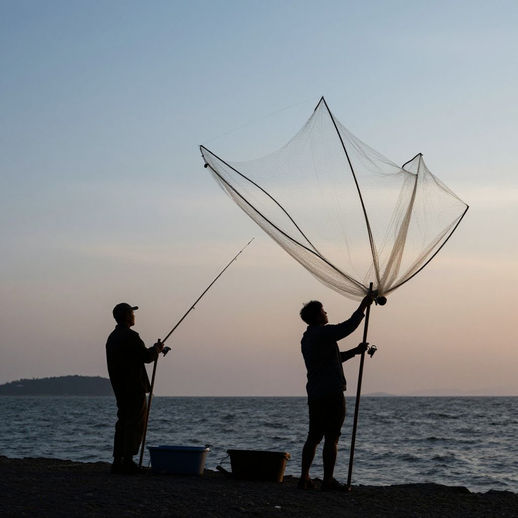 Two fishermen stand silhouetted against a serene coastal backdrop, casting nets that billow dramatically in the wind, evoking a timeless, almost surreal atmosphere where the act of fishing becomes a metaphorical capture of fleeting moments in a high-definition, cinematic visual style.