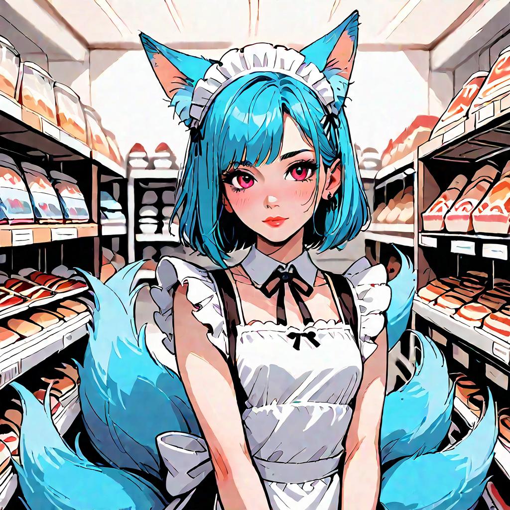 Source_anime, score_9, score_8_up, score_7_up, score_6_up, score_5_up, score_4_up, newest, 1girl, cute, solo, symmetry, straight on, upper body, fox ears, fox tail, kyuubi, multiple tails, small breasts, animal ear fluff, (ear tufts:1.2), maid, pastry, shop, standing, old shop, old interior, cozy, comfy, soft lighting, warm lighting