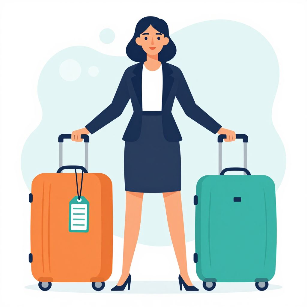 Digital illustration of a woman with short black hair, fair skin, and red lipstick, wearing a navy blazer, white blouse, and black knee-length skirt, standing with one hand on each of two suitcases. The left suitcase is orange with a white luggage tag, the right is teal. She is also wearing black high heels. The background is plain white, emphasizing the subject. The style is clean and modern with bold colors and simple shapes.