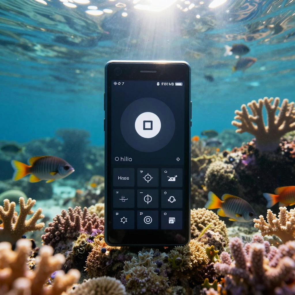A Lumia phone underwater beneath shimmering coral reefs, sun rays penetrating turquoise water, colorful marine life swarming around, surreal contrast between technology and nature, vibrant and immersive, soft focus with photorealistic textures