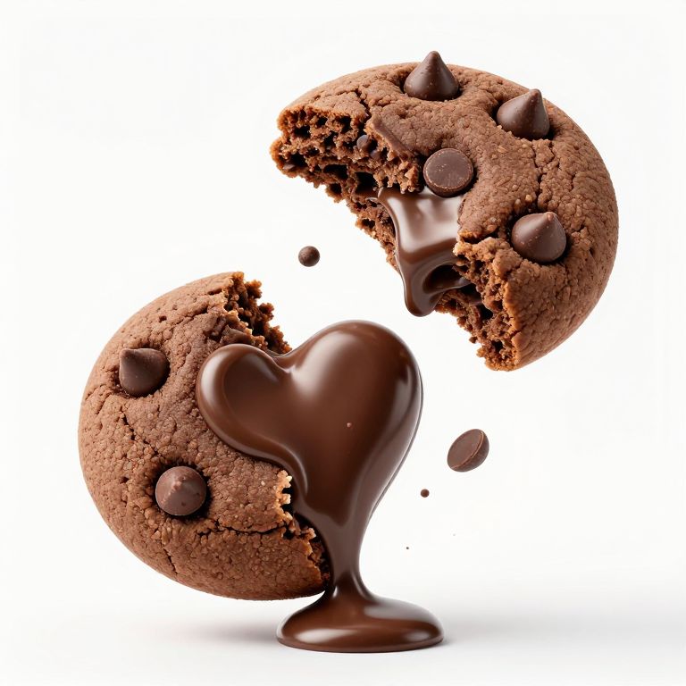 Run Cycle a chocolate cookie broken into two pieces floating in the air, chocolate chips, chocolate melting heart, white background, food photography, close up, low angle shot,