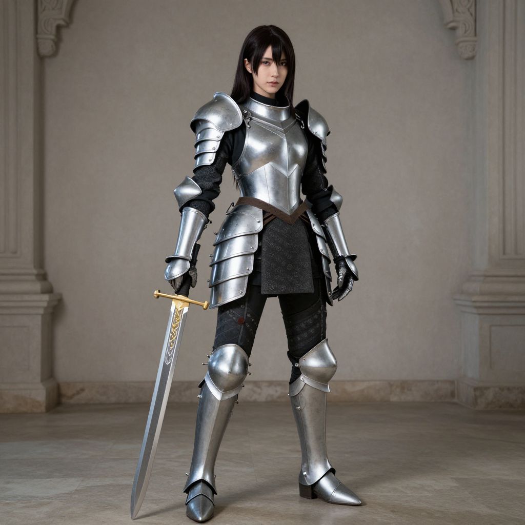Photorealistic CGI image of a young woman with pale skin and long black hair standing in a grand, stone-walled room. She is dressed in shiny, silver medieval armor, including a breastplate, pauldrons, gauntlets, and greaves, with black fabric visible at the waist and thighs. She holds a long, silver sword with a gold hilt in her right hand. Her expression is serious and focused. The background features ornate, classical architectural elements, including carved stone columns on either side. The floor is made of light, polished stone. The lighting is soft, highlighting the reflective surface of her armor.
