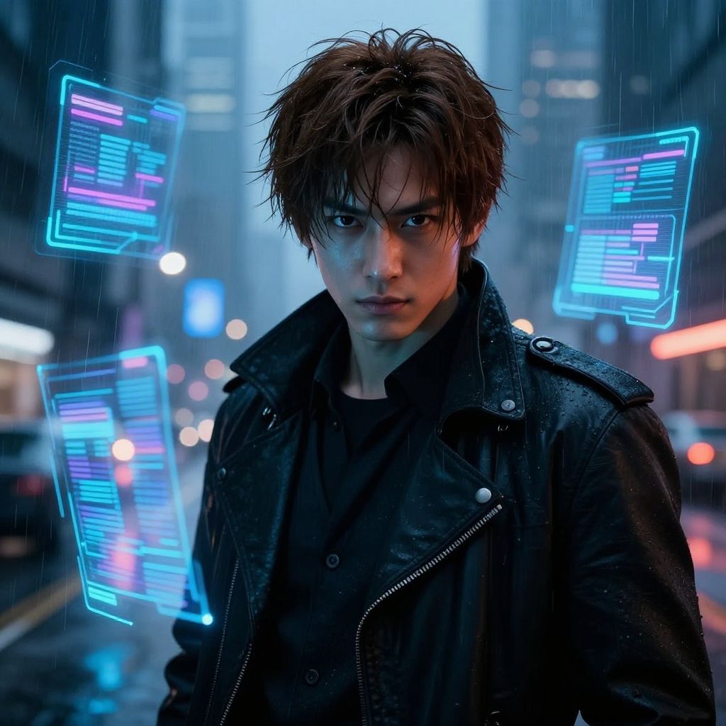 Asian male brown hair, futuristic cyberpunk setting with holographic displays and rain-soaked streets, intense expression, glowing cityscape background, detailed character design