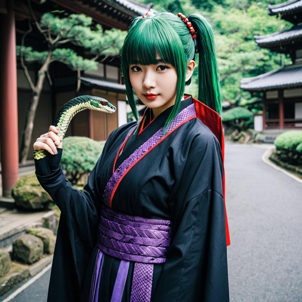 Photo-realistic cosplay photo of person in adagumo no saragimaru costume. 1other, snake tail, red eyes, green hair, short hair, snake hair ornament, short ponytail, split ponytail, blunt bangs, ponytail, purple capelet, japanese clothes, long sleeves, wide sleeves, black sleeves
