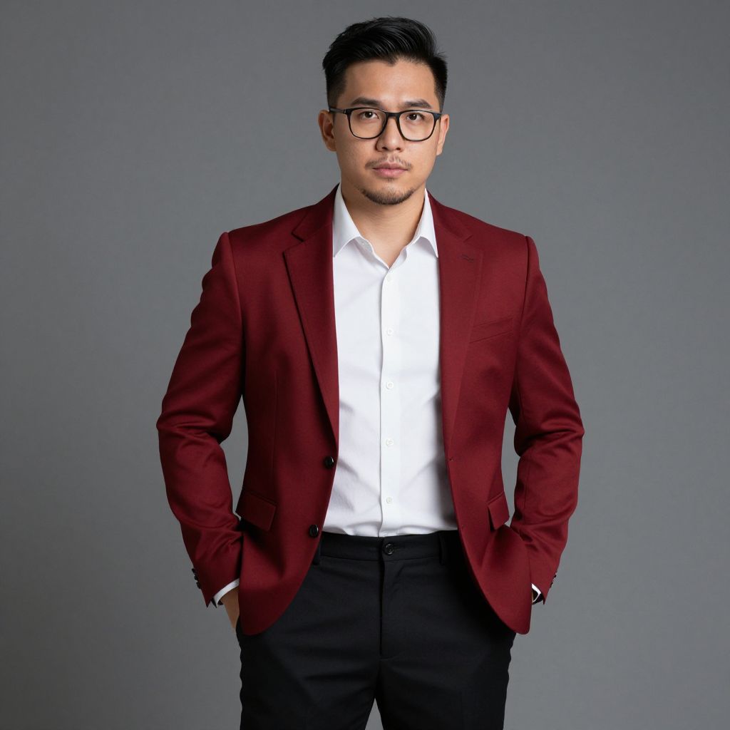 Photograph of a young Asian man with short black hair and glasses, standing against a plain gray background. He wears a sharp, deep red blazer over a white dress shirt, with black pants. His hands are in his pockets, giving a relaxed yet confident stance. He has a clean-shaven face and a slight smile, exuding a professional and stylish appearance. The lighting is even, highlighting the textures of his clothing and the subtle sheen of his blazer. The overall style is modern and professional.