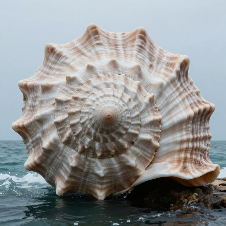 A colossal, spiraling seashell emerges from the sea, its intricate, fractal patterns defying scale and reality as it dominates the coastal landscape with otherworldly grandeur.