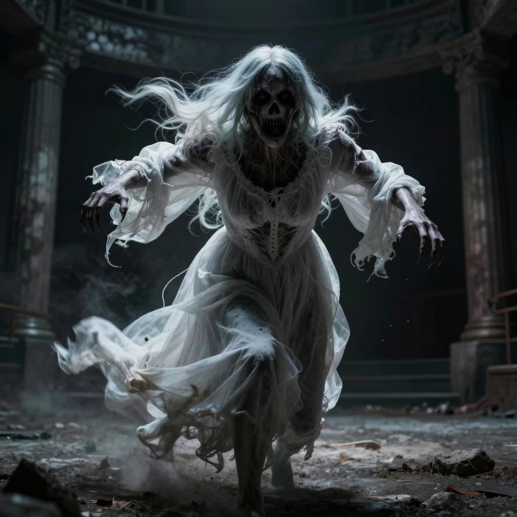 Photorealistic image capturing a dynamic action shot of a terrifying ghostly figure wearing a flowing white dress with long white hair. The ghost has dark, hollow eyes and skeletal facial features, moving aggressively toward the viewer in a dimly lit, abandoned arena with classical stone pillars and a dusty, debris-filled floor. The scene conveys a creepy and unsettling horror atmosphere.