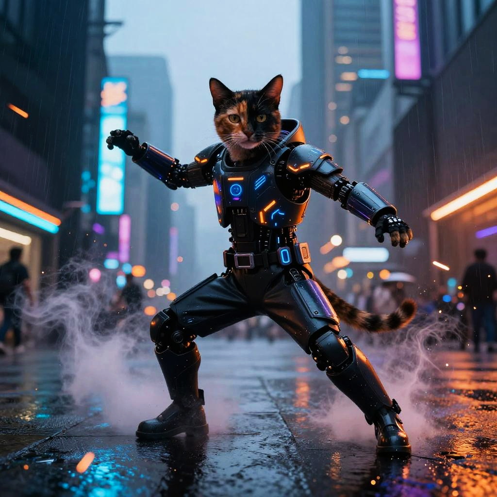(full body) lithe tortoiseshell cat, street dancer in glowing cybernetic wearables, in vibrant neon urban plaza at twilight, blue, orange, and black predominate, hyper-detailing, hyper-realism, tack sharp, cinematic splash screen energy, action-packed composition, dynamic pose, rain and sparks, smoke plumes, glossy reflections, dramatic rim light, volumetric fog, motion blur trails, embers, HDR, film grain, photoreal lighting, rich textures, epic mood