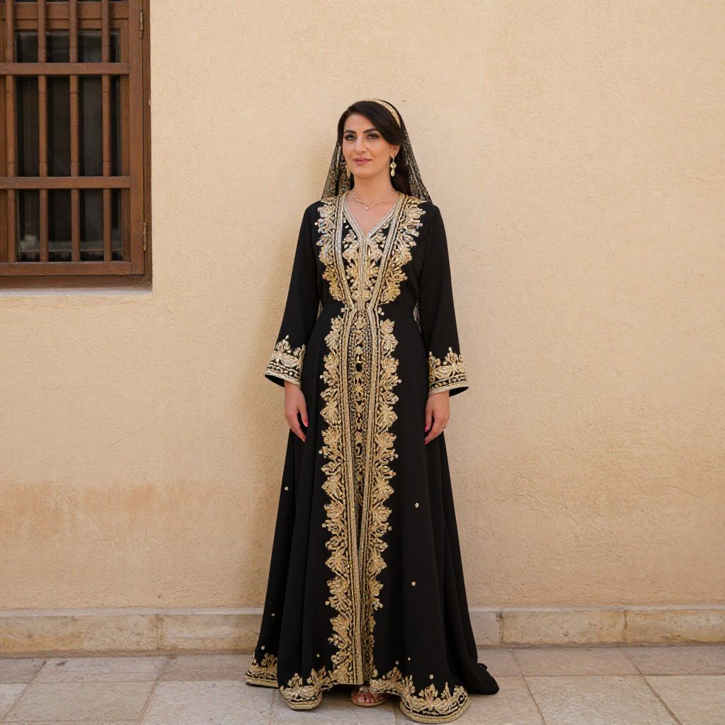 "Traditional Tunisian Wedding Dress, a woman in a traditional dress standing in front of a wall"