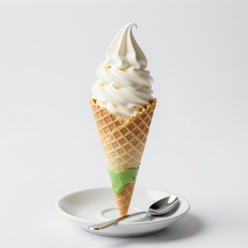 Photograph of a tall ice cream cone with a light brown waffle cone top, white ice cream swirl, and bright green liquid ice cream base. On a white saucer with a silver spoon beside it. White background.