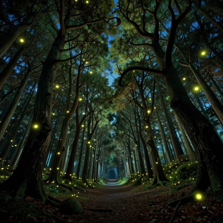 Photograph of a dense forest at twilight, featuring tall trees with dark trunks and branches. The sky is a deep blue, and numerous yellow glowing fireflies are scattered throughout the canopy, creating a magical atmosphere. A narrow, dirt path runs straight through the center, leading into the distance and flanked by fireflies on the left and right. The ground is covered in leaves, and the forest floor is dimly lit. The image has a slight fisheye lens effect, adding a curved perspective.