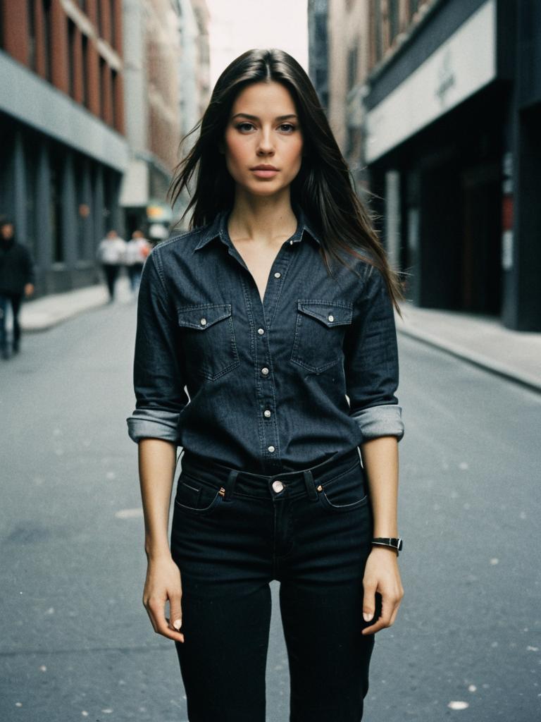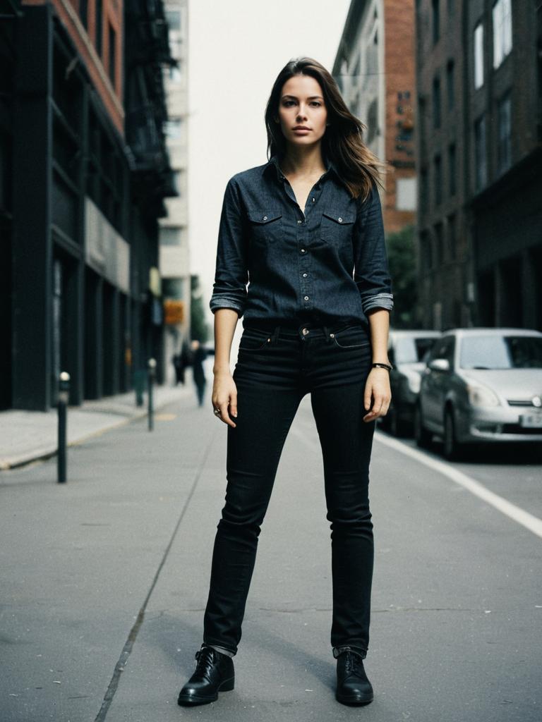 Woman in Black Jeans with Shirt Outfit, cinematic realism, sharp urban portrait