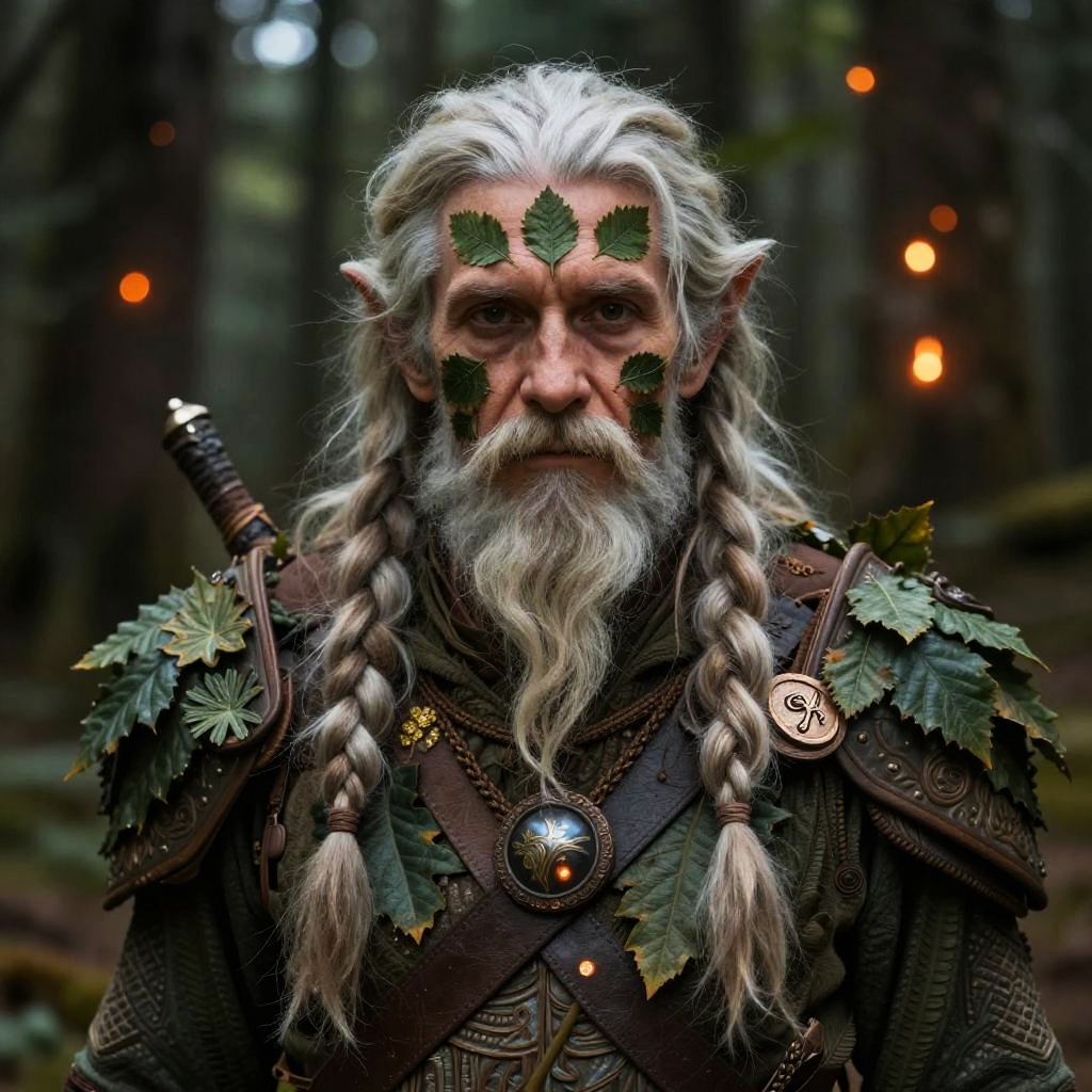 Photograph of a fantasy elf warrior with long, white, braided hair and a full, white beard. His pointed ears are prominent, and his face is adorned with green leaf-shaped markings. He wears dark, ornate armor embellished with green leaves and a large, circular medallion. A sword with a leather sheath is strapped to his back. The background is a blurred, dark forest with glowing orange lights, creating a mystical atmosphere. His expression is serious and focused. The image has a high-contrast, vibrant style, emphasizing the character's detailed attire and ethereal appearance.