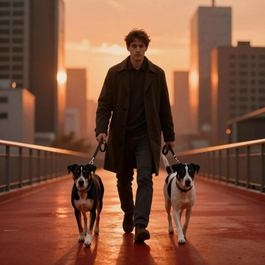 Man in dark overcoat walking on red, reflective surface, holding black and white dog's leash. Cityscape with tall buildings and bridges in fiery orange background. Man has neutral expression. Dog walks beside him, looking forward. Warm, glowing light.