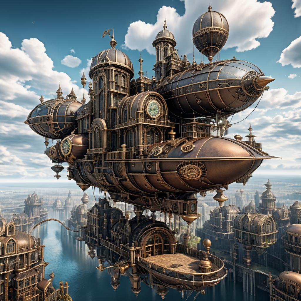 Detailed fantasy landscape featuring a large steampunk airship with intricate gears, floating platforms, and domed towers hovering above an expansive city. The cityscape below includes multiple steampunk-style buildings and waterways under a partly cloudy sky, showcasing an aerial view of this imaginative urban environment.