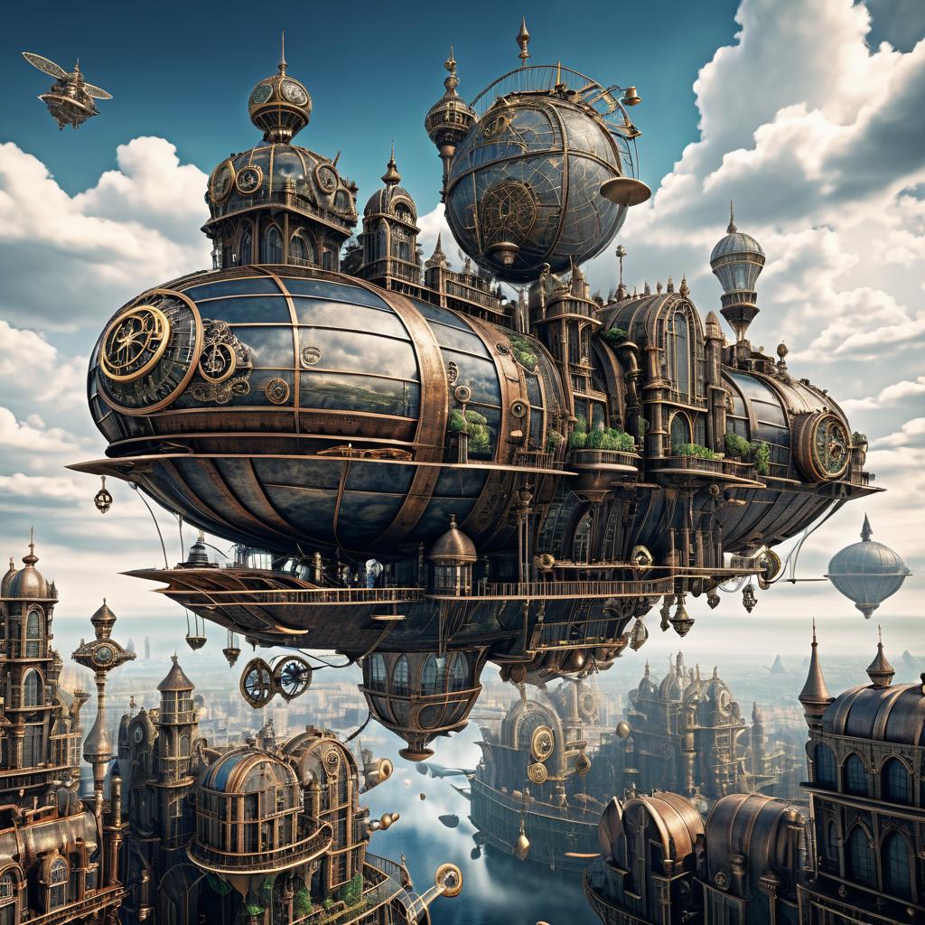 Fantasy landscape of a steampunk airship city in a cloudy sky, with intricate gears, floating platforms, and an aerial view of the expansive city.