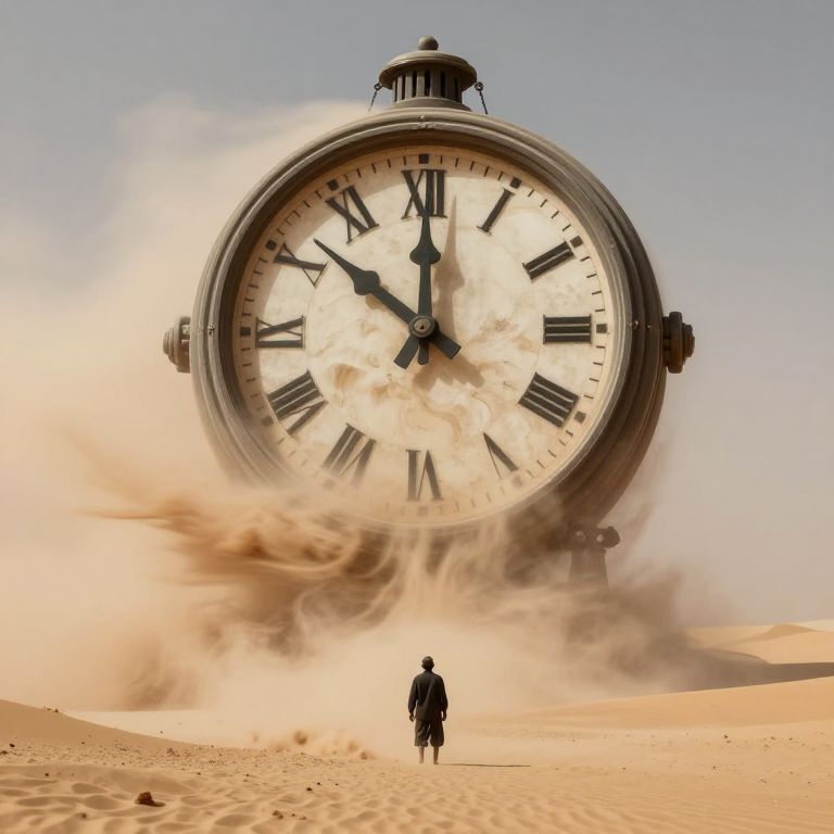 Photograph of a surreal desert scene featuring a giant, vintage-style clock with Roman numerals, suspended mid-air, surrounded by swirling dust. The clock's face is white with black hands and numerals, and it hovers above the sandy dunes. At the bottom center, a solitary figure in dark clothing stands facing the clock, casting a small shadow on the sand. The sky is clear and blue, contrasting with the golden hues of the desert. The image evokes a sense of timelessness and vastness, with the clock dominating the composition and the figure appearing small and insignificant against the desert landscape.