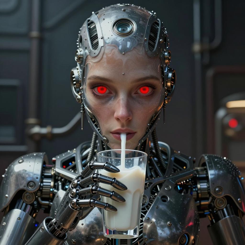 Futuristic cybernetic woman with detailed mechanical metal body and red glowing eyes, drinking a glass of milk through a straw. The portrait highlights intricate robotic features and human-like facial expressions, set against a dark, industrial background. The image blends elements of advanced technology and emotional realism in a sci-fi setting.