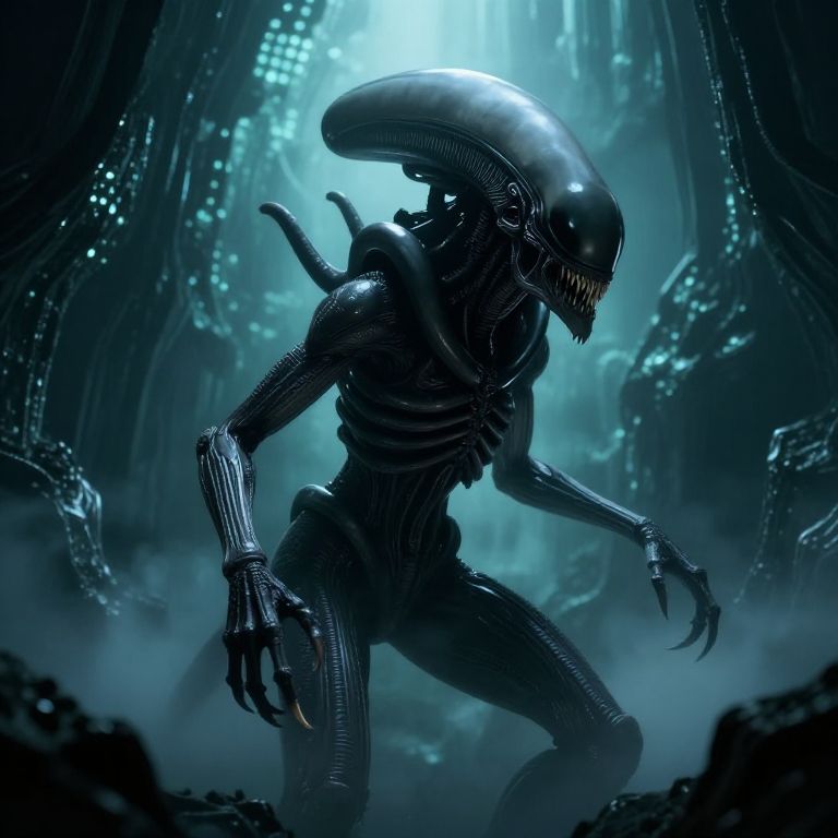 Digital art of a black, alien Xenomorph with a glossy, elongated head, standing in a dark, futuristic, blue-lit spaceship interior