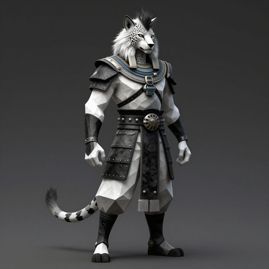 Polygonal Modeling Male Tabaxi fantasy character art with White and black fur. leopard pattern lynx ears. black, white and grey leather armor Egyptian/Japanese themed. shadow monk. tussled main.,