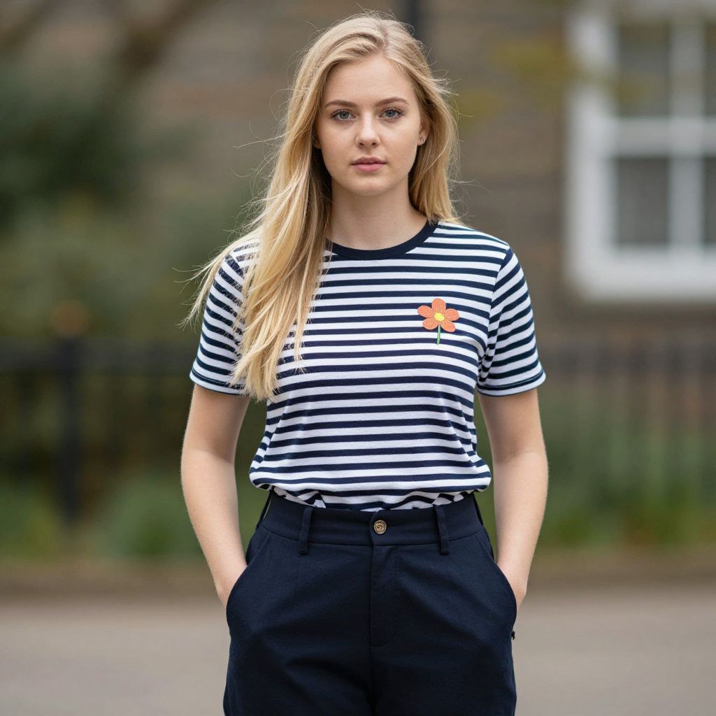 Typical british clothes, 1girl, solo, blonde hair, shirt, flower, hands in pockets, looking at viewer, realistic, long hair, blurry background, blurry, striped shirt, outdoors, pants
