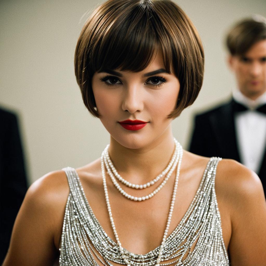 Close-up portrait of a young woman wearing a shiny silver beaded flapper-style dress and layered pearl necklaces. She has short brown hair styled in a 1920s bob and is wearing bold red lipstick. The background is blurred with partially visible male figures in tuxedos, highlighting the subject's vintage glamorous look.