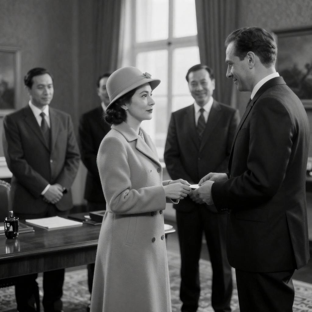 Black-and-white photograph of three people in a luxurious living room. A woman in a light-colored outfit sits on a curved couch, looking at a man in a dark suit bending over her. A man in a tuxedo stands behind them, smiling. Elegant furniture, lamps, and a large ornate mirror in the background. Woman's legs are elevated, man's face shows concentration.