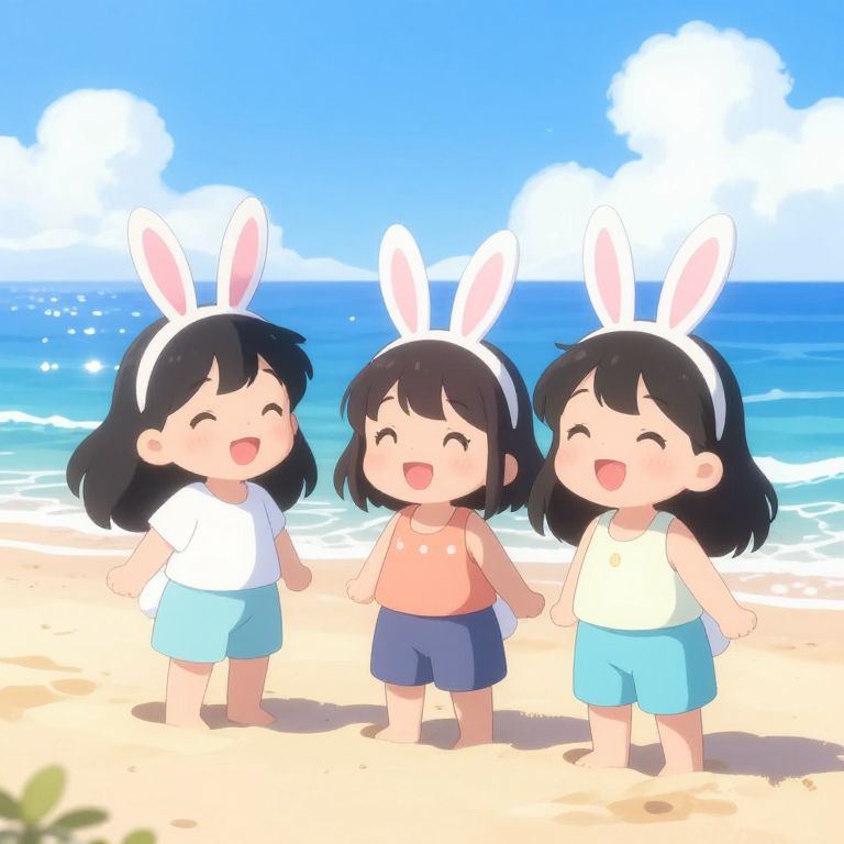 Three chibi-style anime girls with bunny ears, smiling, holding hands on a sunny beach with blue ocean and white clouds.