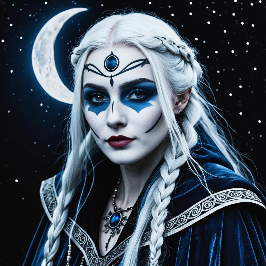 Sleek moon priestess, wearing a silvery midnight cloak, with delicate crescent moon face paint, long braided white hair, glowing pale blue eyes