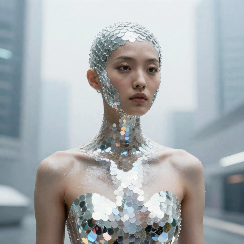 Futuristic, 2095├в┬А┬Щs, young 70 years old beautiful model, face skin is partially covered with holographic mirror transparent scales, standing in a futuristic city, glossy, highly intricate, high minimalistic fashion, photography by tim walker, clear top model face features, gathered hair, fashion editorial accent lighting, cinematic, blurred white clear background, photorealistic octane render, film grain, Leica 50mm, Depth of Field, 32k, Super - Resolution, Megapixel, Optics, Scattering, Glowing, Shadows, Rough, Shimmering, Ray Tracing Reflections, Lumen Reflections, Screen Space Reflections, Diffraction Grading