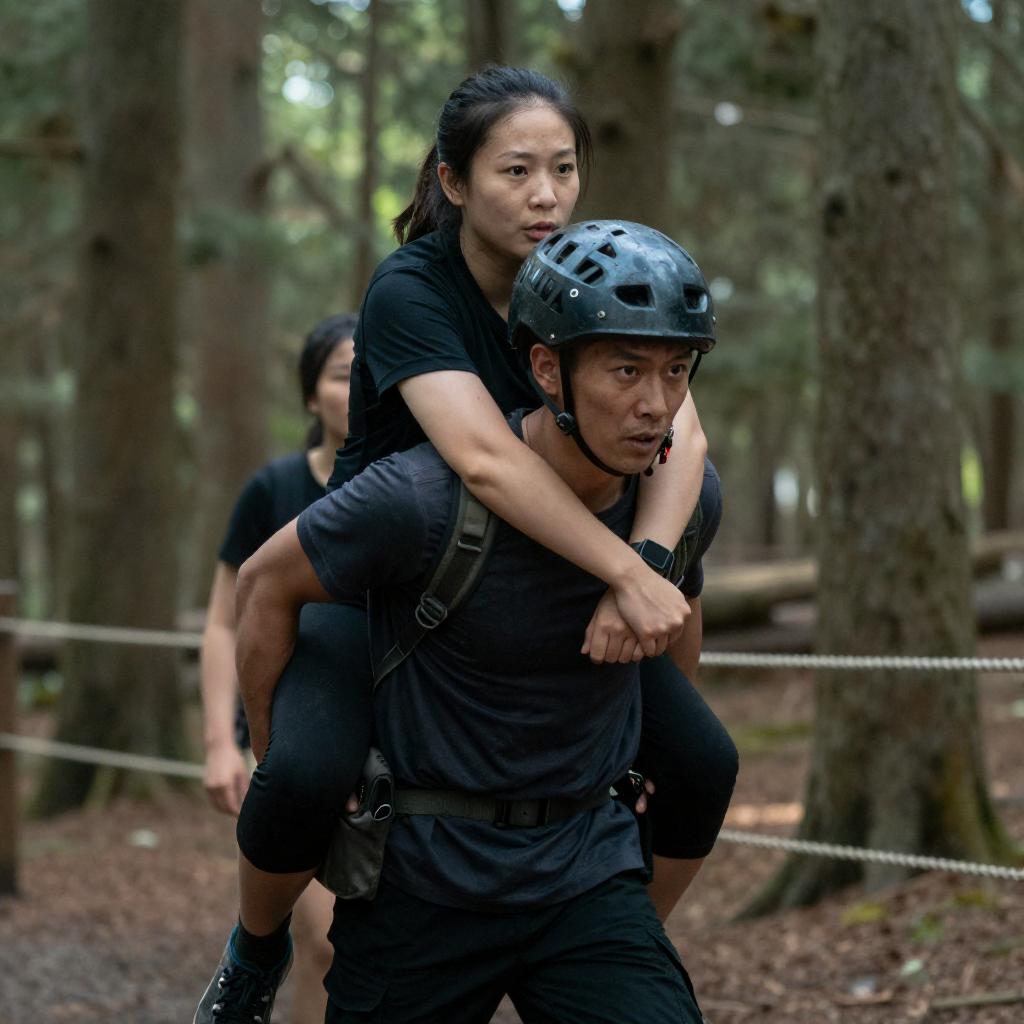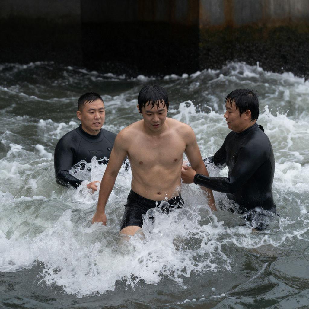 Photograph of two bald individuals in black wetsuits, riding an orange life ring through choppy, dark blue ocean waves. The man in the foreground has an open mouth, appearing surprised, while the woman behind him looks focused. White foam from the waves surrounds them.