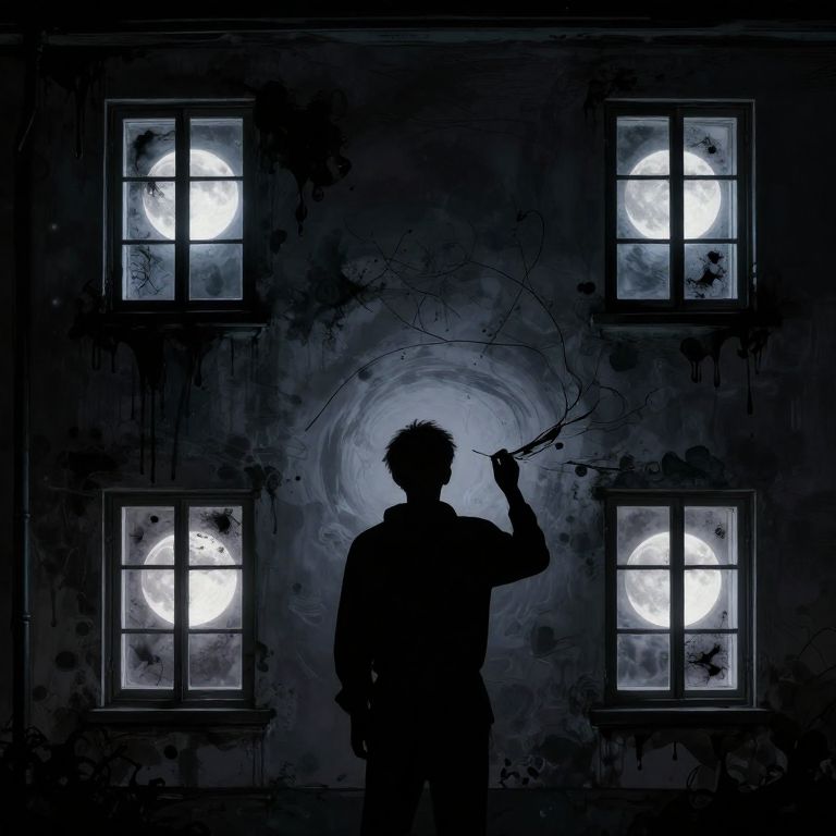 Nighttime arrives as a sentient silhouette, pausing at each window to slowly draw new dreamscapes on the exposed walls with ink made of moonlight.