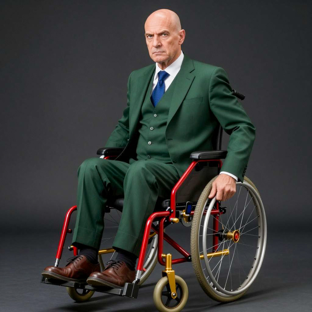 Photograph of a bald, middle-aged man with a stern expression, wearing a dark green three-piece suit, blue tie, and brown shoes. He sits in a gold and red wheelchair with a small blue screen on the armrest. The background is solid black. His right hand rests on the wheelchair's arm, and his left hand is on his lap. The wheelchair has detailed mechanical elements. The base of the wheelchair is circular and gold with a red emblem.
