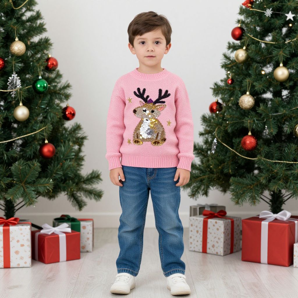 Photograph of a young boy standing in front of two decorated Christmas trees. He has short brown hair and wears a pink sweater with a reindeer print, blue jeans, and white sneakers. The trees are adorned with red, gold, and green ornaments, and are flanked by red and white wrapped gifts with bows. The boy stands on a light wooden floor, centrally positioned, looking directly at the camera with a neutral expression. The background is plain white, highlighting the festive scene.