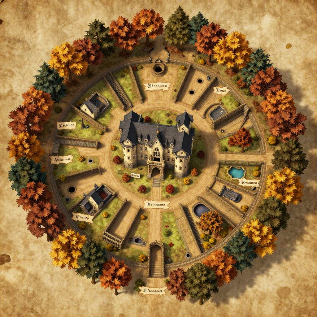 Detailed manor map DnD setting, sprawling estate with multiple wings, gardens, courtyards, and maze-like interiors, vintage map style with aged paper background, compass rose, and grid system, fantasy fantasy RPG exploration focus, soft sepia tones