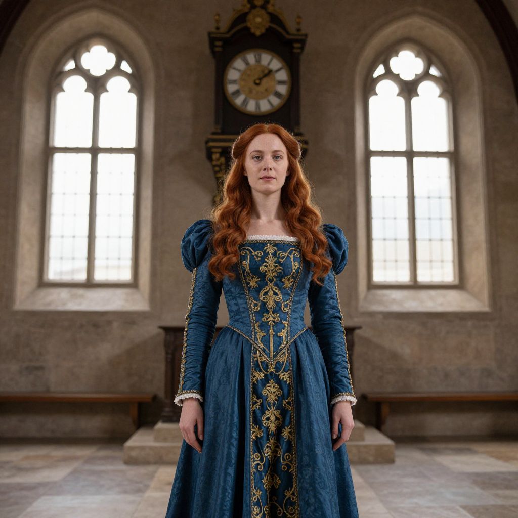 Photograph of a fair-skinned woman with long, wavy red hair wearing a detailed, blue, medieval-style gown with puffed sleeves and intricate gold embroidery. She's standing in a grand hall with a large, antique clock on the wall behind her. The hall has tall arched windows and stone walls, giving it an old, historical feel.