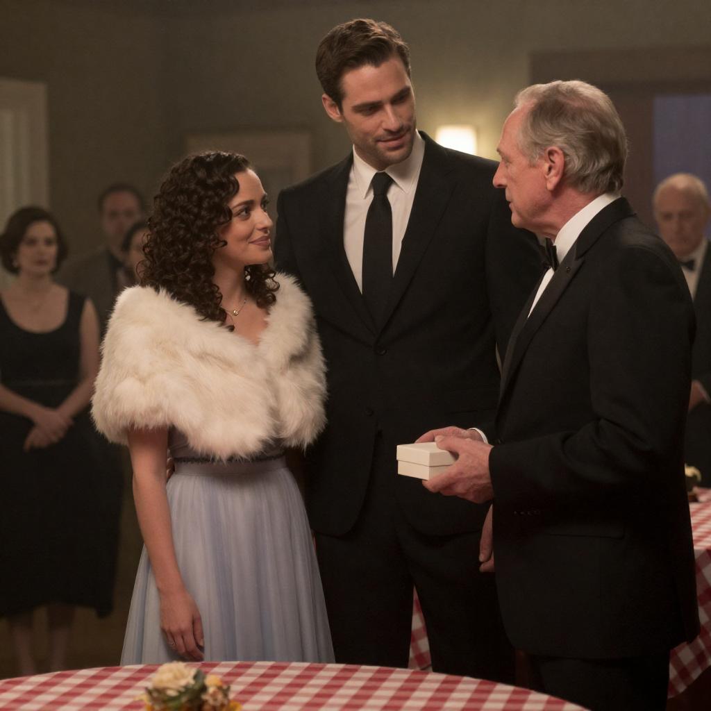 Photograph of a movie scene. A woman with curly dark hair, wearing a white fur stole over a light blue dress, stands between a tall man in a black suit and an older man in a black suit. The older man holds a small white box. Background shows a dimly lit room with other people. Table in front with red-and-white checkered cloth. Woman smiles at the taller man, who looks down at her. Older man looks at the woman.