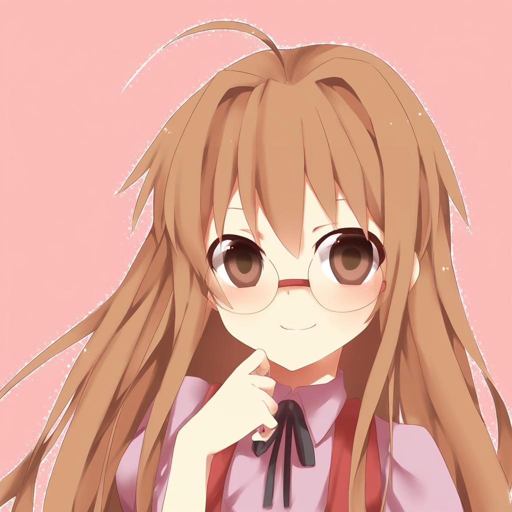 Digital illustration of an anime-style girl with long brown hair and brown eyes, wearing round glasses. She has an ahoge hair strand and is dressed in a pink shirt with a black ribbon tie and red suspenders, set against a soft pink background.